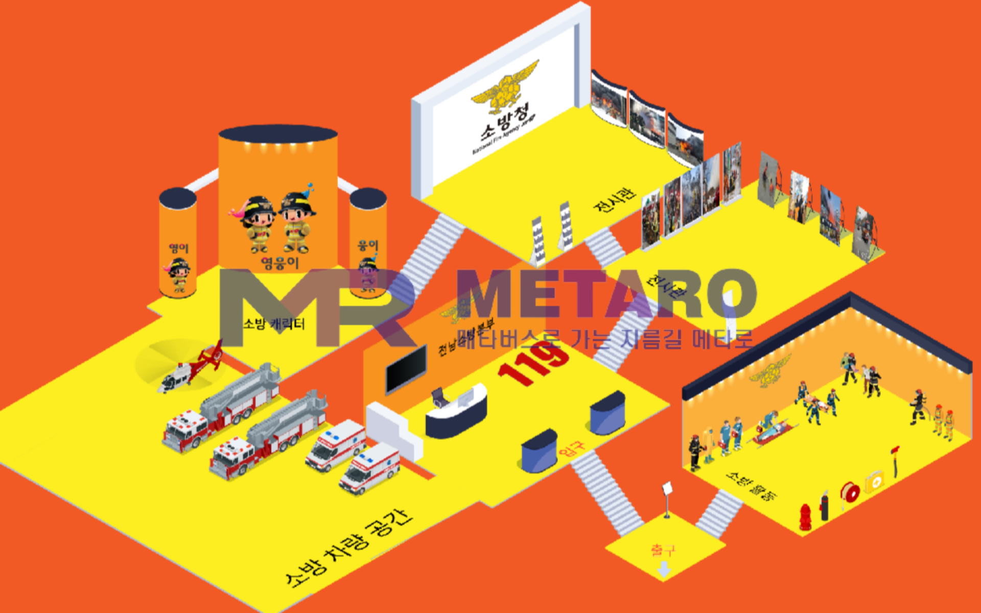 마지막으로 전시관 내부입니다 :) 소방에 관한 모든 것들을 전시하는 것은 물론, 강진소방서에서 직접 보내주신 소방캐릭터, 소방 활동 사진과 영상 또한 시청하실 수 있도록 전시하였습니다. 마찬가지로 X 버튼을 누르시면 모두 관람하실 수 있습니다!