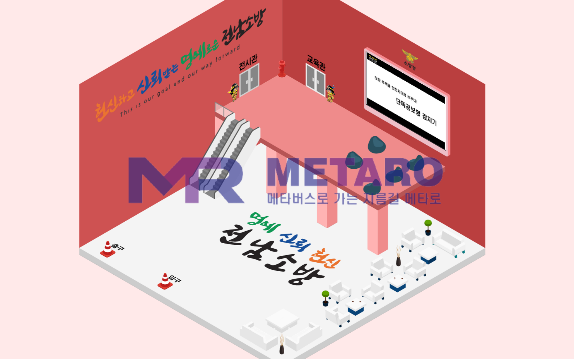 건물 안으로 이동하시면 이렇게 로비가 나옵니다. 로비는 전시관, 교육관으로 이동할 수 있는 포탈이 연결되어 있으며, 오른쪽의 전광판으로 다가가 X 버튼을 누르시면 강진소방서의 시책 홍보 영상 또한 시청하실 수 있습니다!