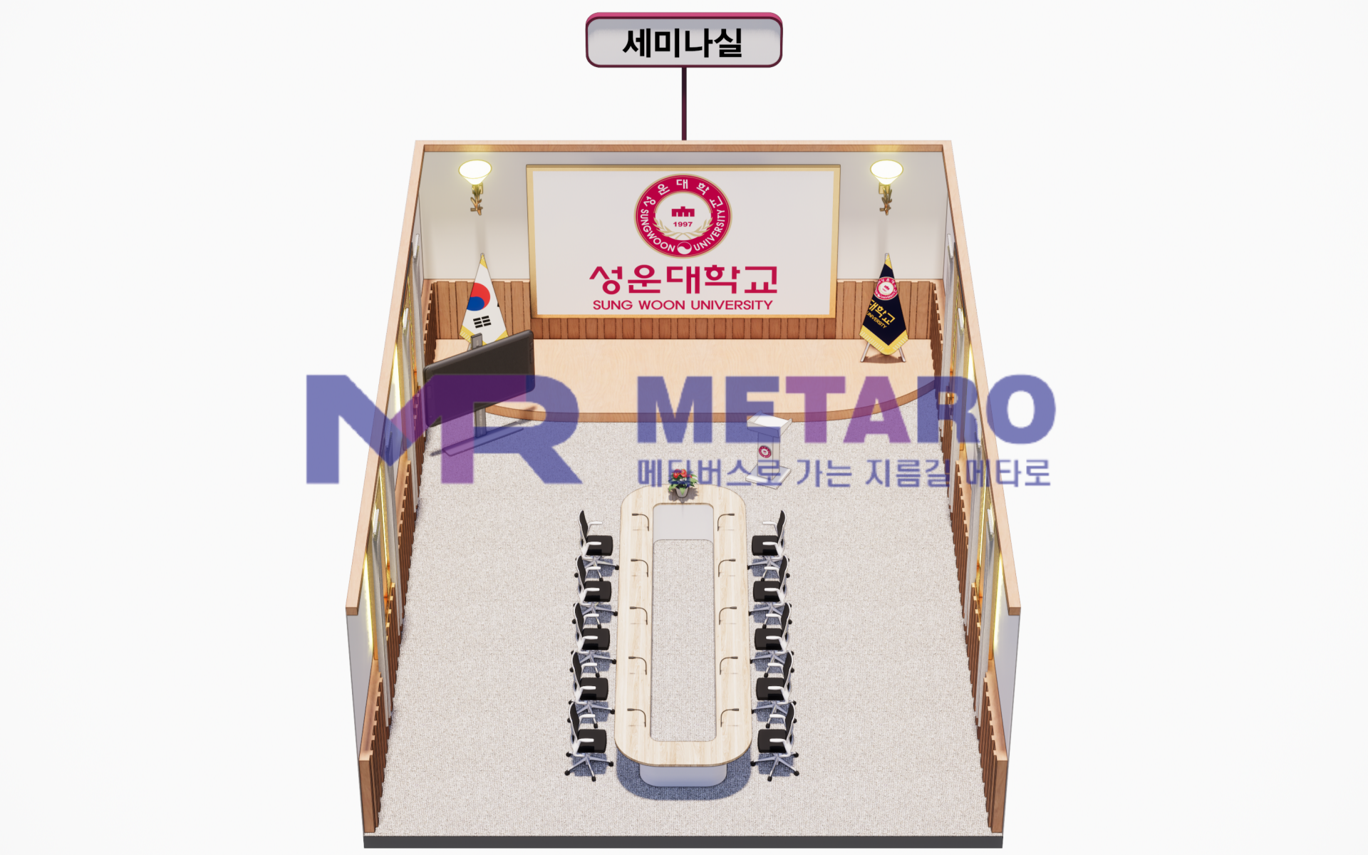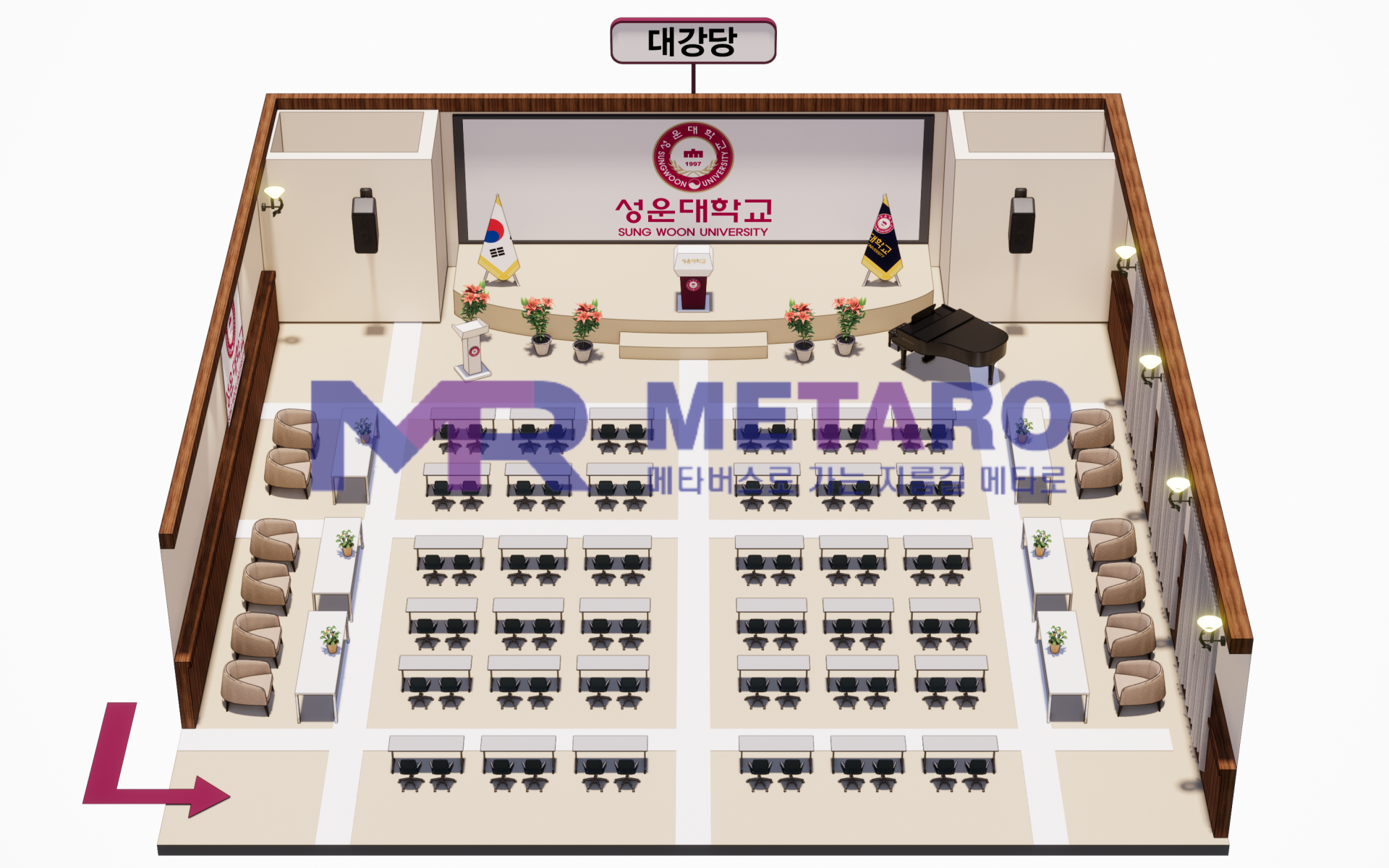 마지막으로 대강당의 모습입니다. 의자를 일정 간격으로 배치하였고, 조명, 깃발, 화분 등 부가적인 요소들을 추가하여 웅장하고 고급스러운, 세련된 느낌을 더하고자 하였습니다.