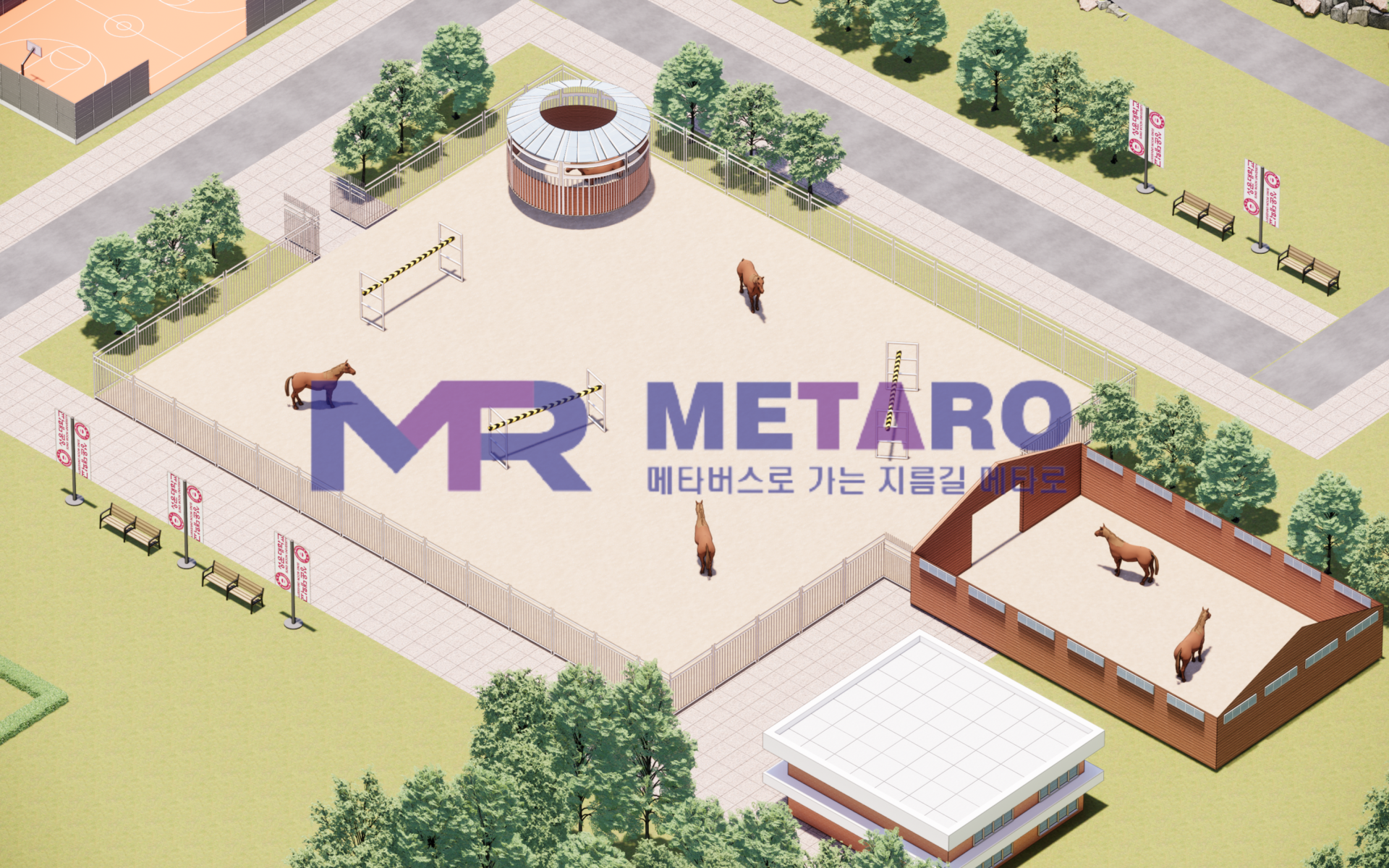 입구에서 가장 가까운 공간은 바로 승마장입니다! 성운대학교에 말산업과가 존재하기에 제작된 공간입니다. 게더타운 내에서도 이렇게 귀여운 말들을 찾아보실 수 있습니다 :)