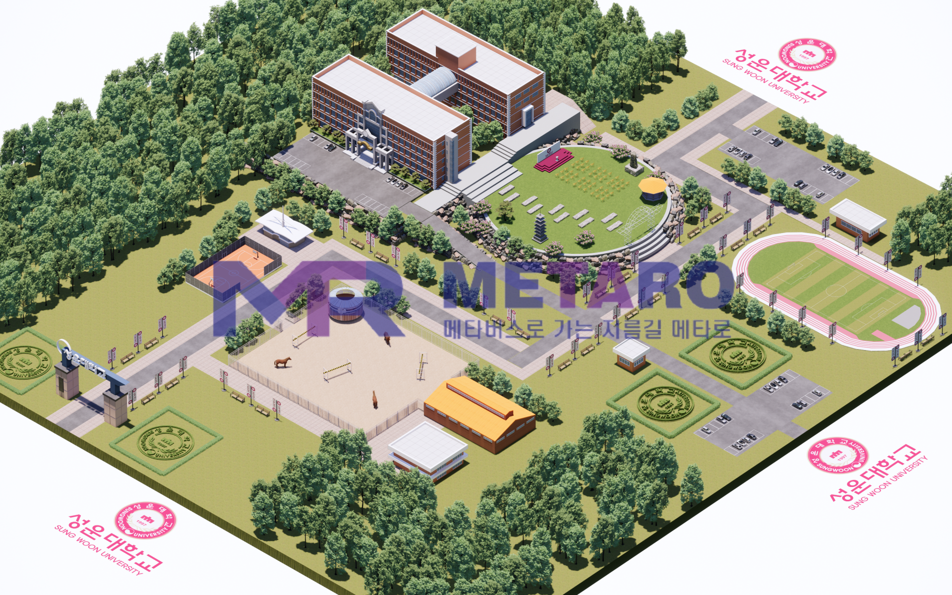 그 다음 외부 공간은 운동장입니다. 마찬가지로 성운대학교 로고를 새긴 잔디밭이 배치되어 있고, 실제 게더타운에 들어가 보시면 운동장에서 카트 체험도 하실 수 있답니다.