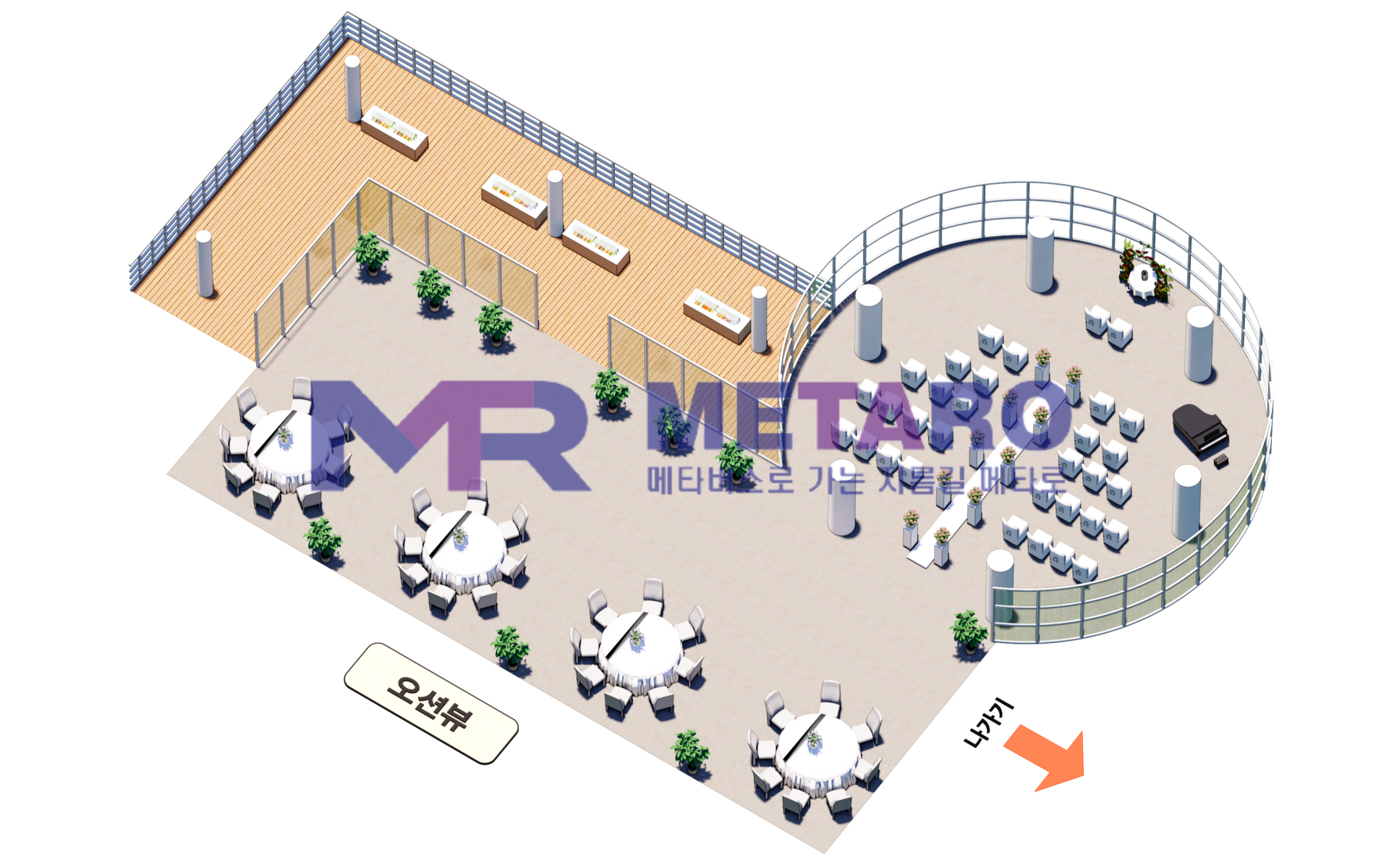 오션뷰(웨딩홀)의 모습입니다. 예식장과 연회장이 합쳐진 공간으로, 마찬가지로 실제 오션뷰의 모습을 그대로 구현하였습니다. 예식장의 위쪽으로 이동하시면 오션뷰 이미지들 또한 관람하실 수 있습니다.