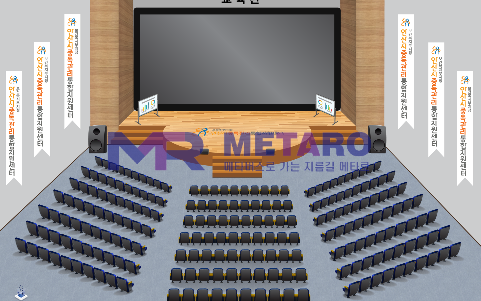 마지막으로 교육관의 모습입니다. 센터의 로고를 반영하여 현수막을 제작하였고, 실제 강당의 모습을 그대로 구현하도록 노력하였습니다.