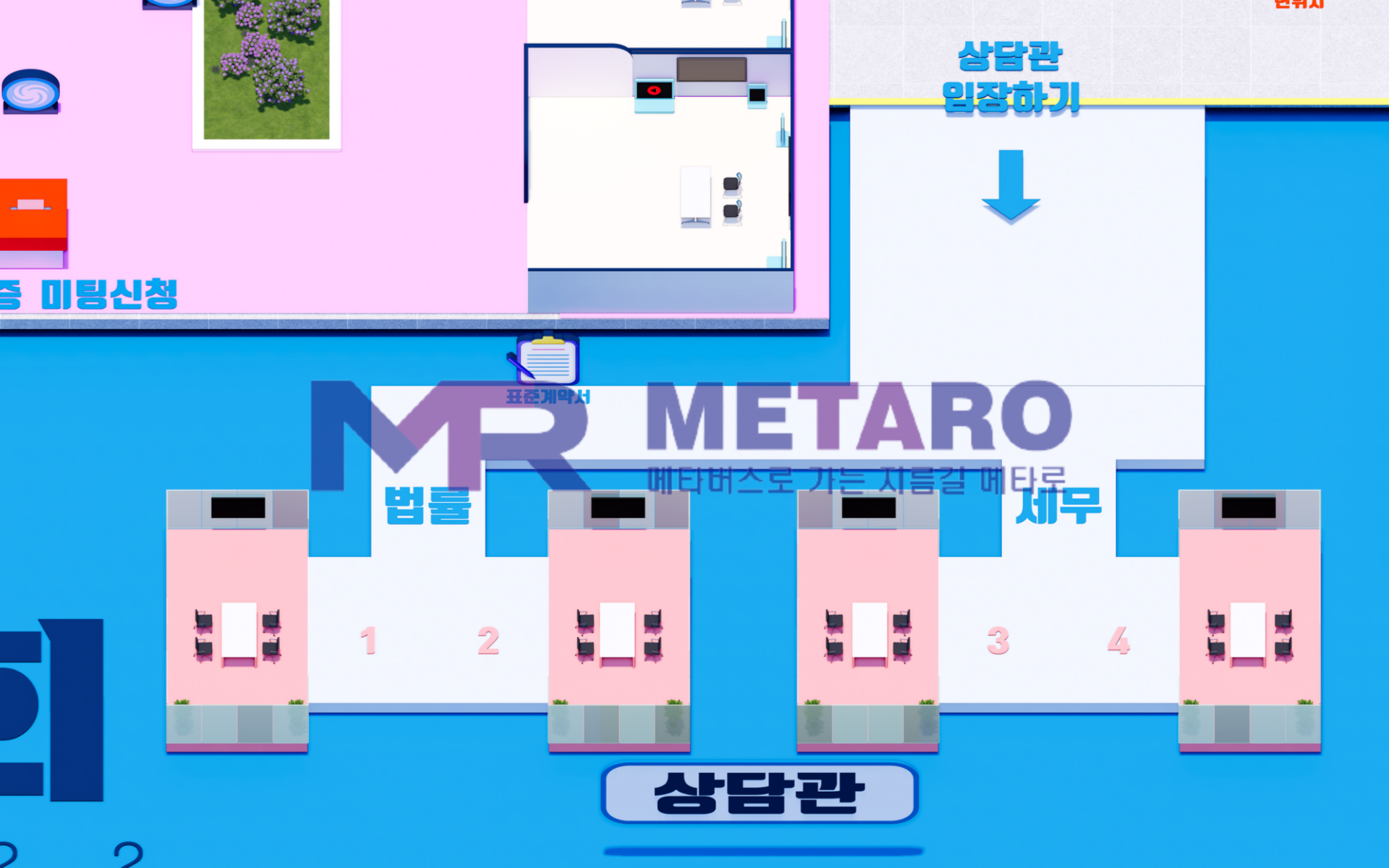 맵 중앙의 북쪽과 남쪽에는 이렇게 미팅룸, 상담관이 배치되어있습니다. 사람들과 프라이빗하게 대화할 수 있는 공간입니다.