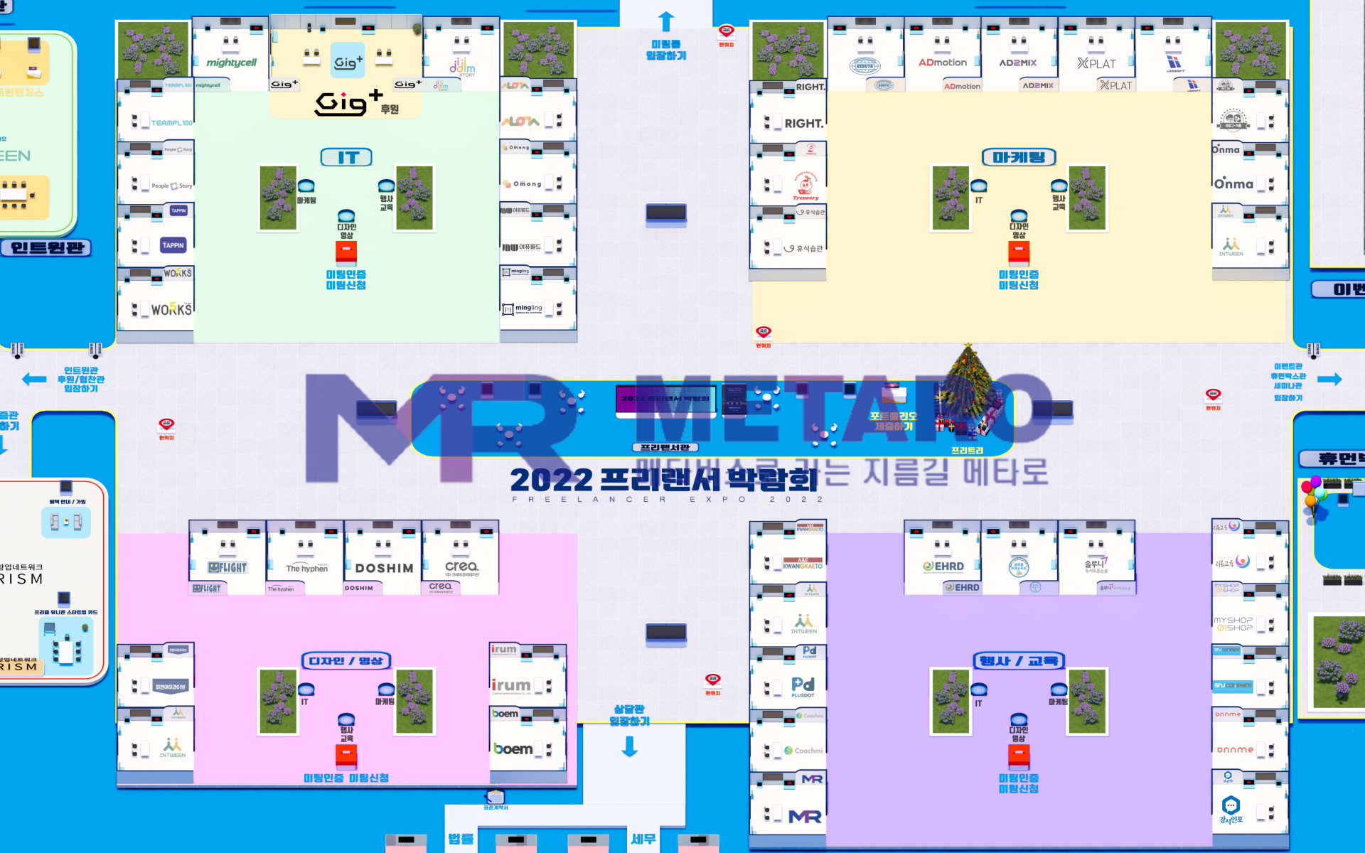 오른쪽으로 이동하시면 이렇게 메인 맵의 중앙으로 들어오실 수 있습니다. 이 공간은 프리랜서관으로, 맵의 제작 목적이 프리랜서 박람회 행사 진행인 만큼, 각 분야의 프리랜서마다 개별적인 공간을 제작하였습니다.